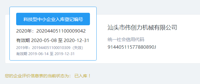 Shantou Wetry Machinery Co., Ltd. is appraised as "Technology-Based SMEs " in 2020.The warehouse entry registration number is 202044051100009042