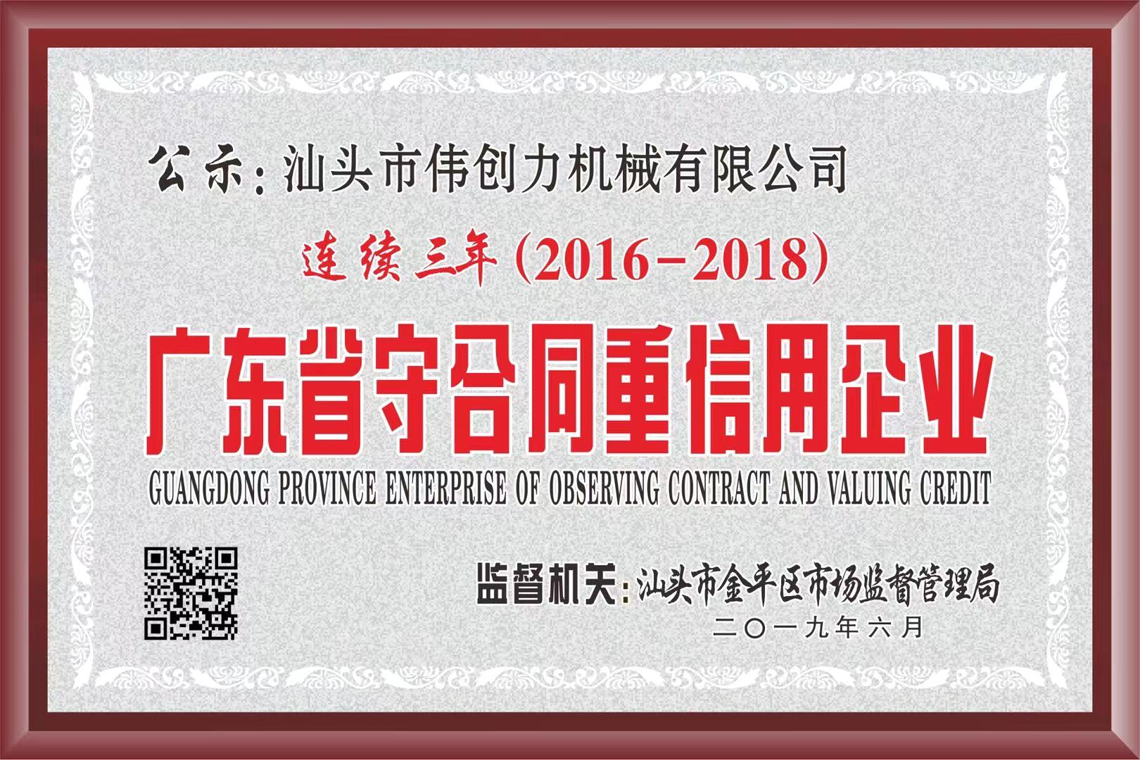 我司被授予“連續(xù)三年(2016-2018)廣東省守合同重信用企業(yè)”稱號